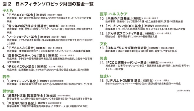 基金数は2024年4月10日現在、15を数える。その内容は図2に示したように、多岐にわたっている。同財団は2020年4月27日に設立、公益認定を受けたのは翌年3月25日。従って、まだ歴史はそれほど深くない。それでいながら、15基金を設立するまでに成長しているのは、寄付して社会貢献をしたいというニーズの厚さと、同財団のモデルに対する信頼性があるからこそにちがいない。後者については後述するとして、同財団が誕生した経緯から触れたい。