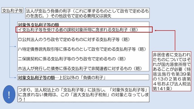 「対象外支払利子等の額」について規定した「イ 支払利子等を受ける者の課税対象所得に含まれる支払利子」の詳細について、租税特別措置法施行令第39条の13の2第6項第4号および法人税法第141条によると、「外国法人」に対して支払った利子のうち、「対象外支払利子等の額」に含められるためには、それが国内源泉所得である必要がある。