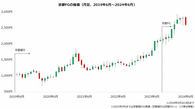 株価は順調に値上がりしています。2024年6月14日までの5年間で約2.5倍に上昇しました。銀行株は金利上昇を受け好調に推移しており、京都FGも同じように買われているようです。