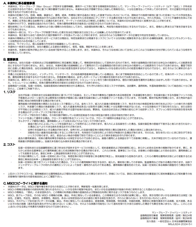 ※マン・グループ:1783年創業。運用資産残高1,782億ドル(約29兆円/2024年6月末時点)。ロンドン市場に上場(FTSE250指数の構成銘柄)。日本においては、マン・グループ・ジャパン・リミテッド東京支店を通じて、機関投資家および販売会社等にサービスを提供。