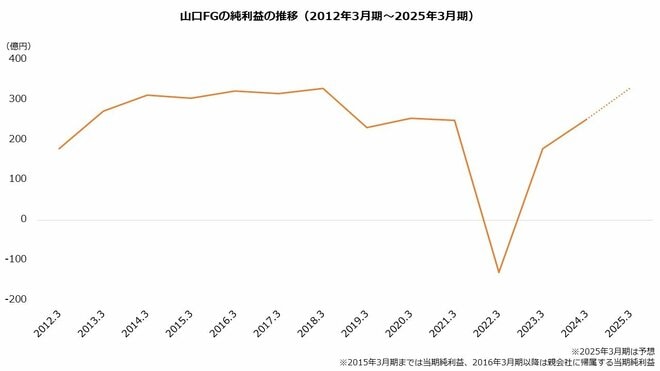 山口フィナンシャルグループは今期(2025年3月期)、純利益ベースで過去最高益を計画しています。達成すれば最高益の更新は7期ぶりとなり、15年ぶりの最終赤字だった2022年3月期からV字回復を果たす格好です。