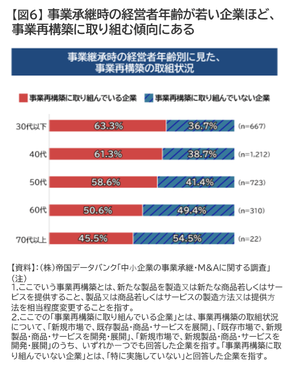 事業承継後の経営者の年齢が若いほど、事業再構築に取り組む傾向が強く、事業成長が期待できます。そのため、後継者を育成し、早期に事業承継を行うことが、企業の存続と成長には重要です。