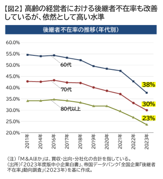 図2をご覧いただくと、高齢の経営者における後継者不在率は改善しています。つまり引き受け手がいるということですが、それでもまだ高い水準だということです。