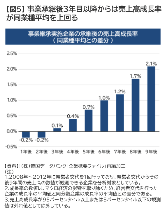 図5をご覧ください。事業承継後3年目以降からは売上成長率が同業平均を上回る、とありますが、3年目以降というところがポイントです。後継者が会社を継ぐと、最初は会社のことがよくわからないですから、1年目、2年目で会社の状況が分かって、3年目くらいになると好転し始めるという、当たり前といえば当たり前のデータだと思います。社内の信任を得るのも大変なので、最初は厳しいところもありますが、3年くらいすると従業員からも取引先からも信任を得られて成長率が上がっていきます。