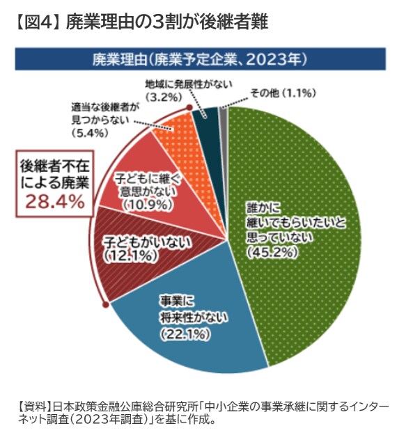 図4をご覧いただくと、廃業理由の3割が後継者難となっています。後継者不在の廃業、つまり子どもがいない、継ぐ意思がない、適当な後継者が見つからない、ということです。継ぐ人がいなければ、当然潰すしかない、ということになります。