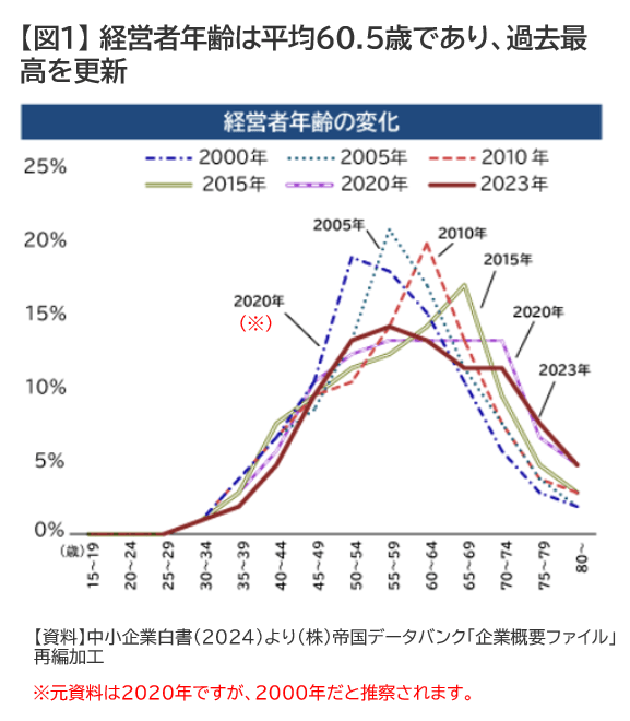 図1の通り、経営者の高齢化が進んでいます。平均は60.5歳となっていますが、高齢の方の割合が高く、グラフの山が年々右側にずれています。後継者がいなければ経営者はやめられないので、この高齢化はまだまだ進むと思います。
