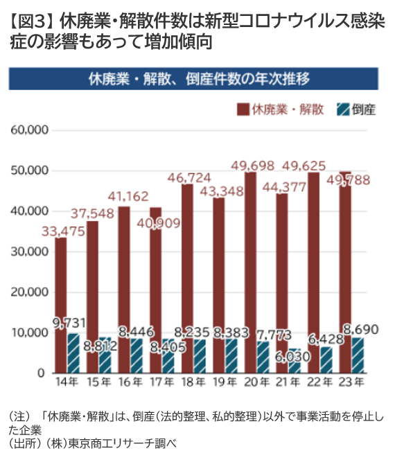 図3をご覧いただくと、休廃業・解散件数は増加傾向にあります。これは、新型コロナの影響もあります。コロナ融資の返済が始まり、返済できないところが倒産するということが非常に多く出てきていると思います。ではコロナがなければこれほど多くなかったのかというと、資金繰りは苦しいですから、関係なく倒産はするでしょう。コロナの時には、非常に有利なコロナ融資がありましたが、コロナ融資だとしても借りたら返さなければいけません。返すためにはどうしたらいいかというと、儲けないといけないのです。