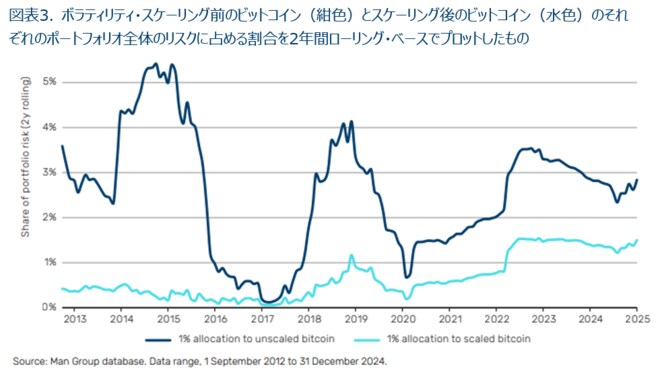 図表3は、ボラティリティ・スケーリング前のビットコイン(紺色)とスケーリング後のビットコイン(水色)のそれぞれのポートフォリオ全体のリスクに占める割合を2年間ローリング・ベースでプロットしたものです。