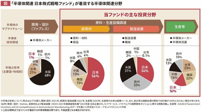 2つ目のポイントは、半導体市場における日本企業の独自のポジションだ。日本の半導体関連企業の特徴として、米国のNVIDIAのような半導体の「開発・設計」を担う企業があまりない点が挙げられる。その半面、半導体のサプライチェーンの中で、「部素材」と「製造装置」の領域で日本は強みを持つ(図参照)。「市場占有率を見てみると、製造装置は世界の3分の1程度、部素材では世界の半分以上のシェアを持っています。半導体の生産では国際的な分業体制が敷かれているため、サプライチェーンとして捉えることが重要になりますが、そのサプライチェーンに日本企業は欠かすことができないわけです」(佐相氏)。