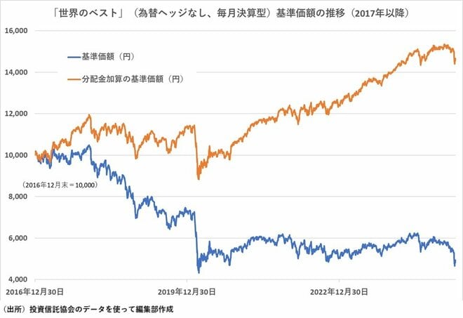 「世界のベスト」が毎月決算型に移行した2017年は、運用成績と分配金額の関係が適合せず、分配金払出後の基準価額は半値以下の水準に低迷することになった。毎月決算型に変更して以降、運用成績(分配金込み基準価額)は横ばいで推移する中で、毎月の分配金を払い出すことによって基準価額が一方的に下落した。そのような低迷の時代を経て、2020年4月以降にパフォーマンスが向上し出すと、分配金を払い出しながらも基準価額は横ばいになった。