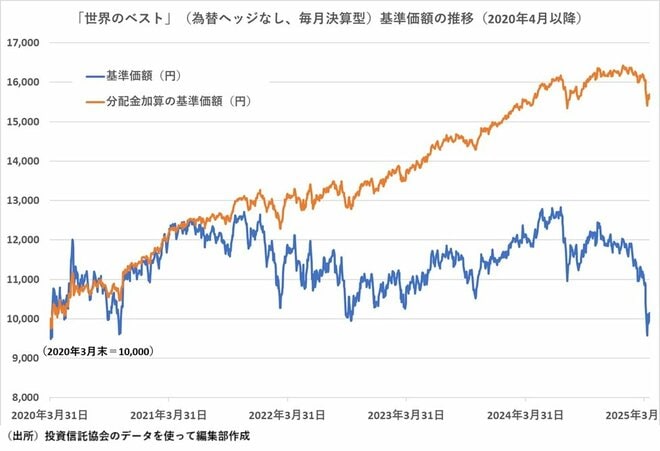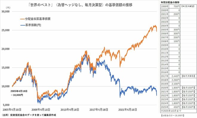 「世界のベスト」は、最初は年2回決算型として設定された。毎月分配型に決算頻度が変更されたのは2017年からだ。そして、2020年以降「毎月150円の分配金」が定着した。