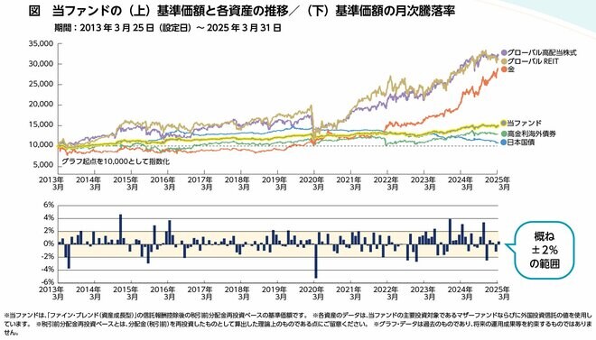 1つはリスク・リターン効率の改善。「ファイン・ブレンド戦略により価格変動の大きな資産の組み入れは少なくなるため、その影響を受けにくくなり、安定的な投資成果が期待できる」(先山氏)。2013年3月25日の設定日から2025年3月末までの期間では、同ファンド(資産成長型)のリスクは年率4.9%、リターンは年率3.5%、シャープレシオは0.70で、ローリスクバランスファンド群の中でも良好なパフォーマンスをあげている。