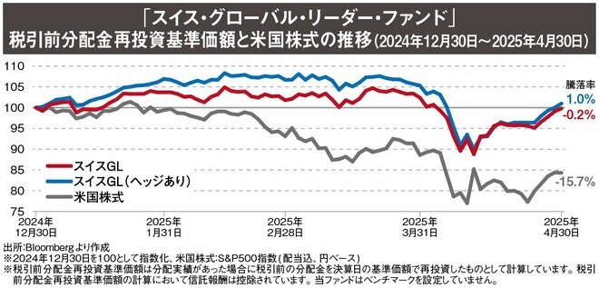とはいえ、足元では「トランプ関税」の影響を受けているのも間違いなく、年初来の騰落率は-0.2%となったものの(為替ヘッジなし、分配金再投資)、S&P500指数の-15.7%と比較すれば下落幅は小さい。為替ヘッジありでは+1.0%とプラスとなっていた(2025年4月末時点)。その理由を、UBPインベストメンツの仮家基之氏は次のように説明する。「スイスは米国への外国直接投資額で世界第7位。雇用創出にも積極的で、約500社のスイス企業が全米50州で活動し、50万人の雇用を支えています。こうした多層的なビジネス構造がスイス株式の安定性を高め、関税リスクに対する緩衝材にもなっているのです」。