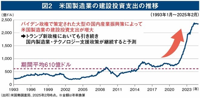 政策支援ではバイデン政権下で成立したCHIPS法などの法案は記憶に新しい。これらを受け米国建設投資支出は過去数十年にないトレンドで増大。産業ロボット分野などがこの恩恵を受けるのはこれからという状況だ。しかし最近はトランプ新政権が法案撤回を匂わせるなどその動向に注目が集まっていた。この点、「トランプ大統領はイノベーションを支持しており、今後どのような形になったとしても政府として自動化分野への政策支援は続く」とみる。