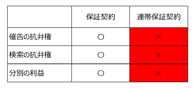 上の図をご覧いただくと、保証契約では「○(権利あり)」、連帯保証契約では「×(権利なし)」となる項目がいくつかあります。具体的には、「催告の抗弁権」「検索の抗弁権」「分別の利益」という3つの権利が、連帯保証契約にはありません。つまり、保証契約よりも、連帯保証を負う側の人は、かなり厳しい内容を負わされることになります。