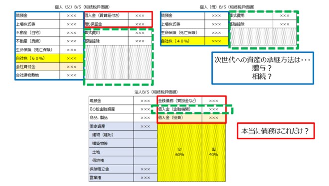 では、社長が亡くなった場合、個人で負っていた連帯保証はどうなるのでしょうか。下の図をご覧いただくと、下段には法人のB/S(貸借対照表)、上段には父親と母親の個人のB/Sがそれぞれ並んでいます。