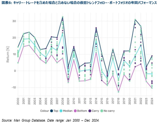 非トレンドフォロー戦略、ひいてはキャリー・トレードへの配分比率は、運用マネジャーによって様々であり、その大きさは主に投資家がどのようなリターン特性を求めるかによって決まります。われわれはどの程度の配分が「最適」かを断言するものではありませんが、パフォーマンス格差の観点から見ると、その配分は年によってはパフォーマンスに大きな影響を及ぼします。これは、図表6で分布の両極端に紫色の点(キャリー・トレード)が集積していることからも明らかです。例えば、2016年と2023年には、キャリー・トレードへの配分がプラスに働きました。特に2023年は、一部の仮想ポートフォリオが良好なリターンを獲得した主な要因がキャリー・トレードでした。米国の金利が「長期にわたり、高止まりする(higher-for-longer)」との見方から、低金利を維持または低金利へ移行している日本のような国の通貨や債券を活用したキャリー・トレードが収益に貢献しました。しかしながら、市場危機時のパフォーマンスに関しては、図表4でキャリー・トレードを組み入れたポートフォリオ(紺の丸印)はピンク色(取引スピードが高速)と水色(取引スピードが低速)の両方にまたがって分布していることから、キャリー・トレードは市場危機時におけるパフォーマンス格差にあまり大きな影響を及ぼしていないものと思われます。