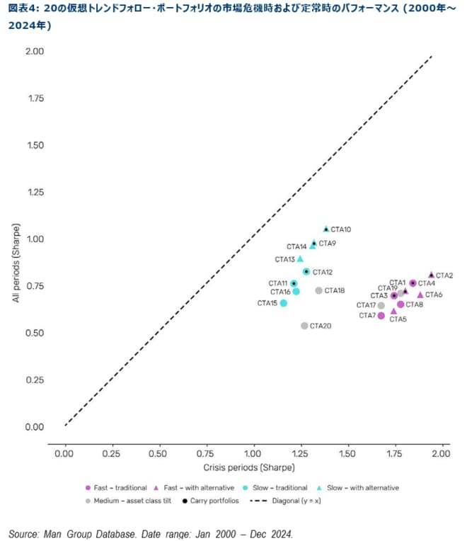 この長期パフォーマンス分析から得られる知見は、異なる特性を持つトレンドフォロー戦略が、異なる局面において良好なリターンをあげるということです。そのため、優れたトレンドフォロー戦略のポートフォリオを構築するための「正しい」方法はひとつではなく、個々の投資家の選好に応じて選択が可能となります。多くの投資家は、トレンドフォロー戦略の分散効果や、市場危機時の損失抑制効果を期待して、配分を行っています。したがって、市場危機時に市場平均を上回るリターンを生み出すパラメータが、パフォーマンス格差において極めて重要な役割を果たします。この点を掘り下げるため、図表4では、長期パフォーマンスを市場危機時と定常時とに分け、どのパラメータがクライシス・アルファ(市場危機時の超過収益獲得)特性をもたらすかを考察しています。