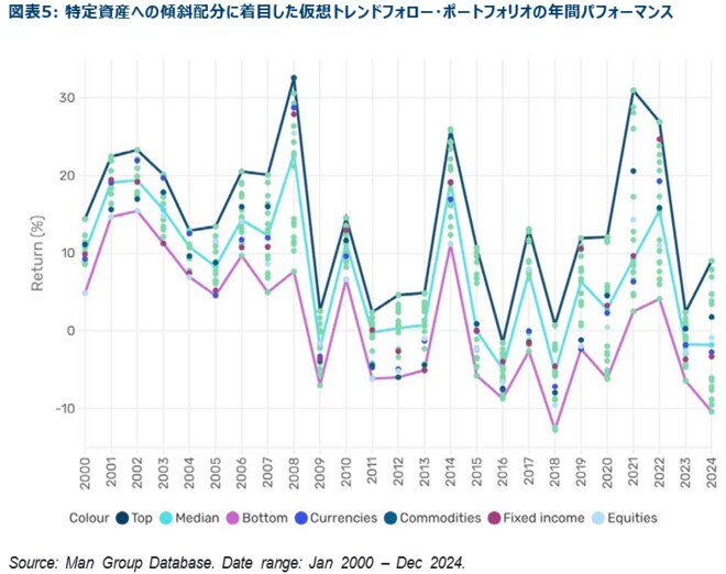前述の通り、能動的な資産クラスへの傾斜配分もまた、トレンドフォロー戦略のパフォーマンス格差につながります。図表5では、20の仮想トレンドフォロー・ポートフォリオのリターンをプロットし、特定の資産クラスへの傾斜を色で示しています。