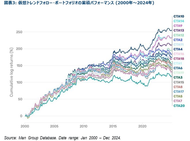 - このことをモデル化するため、われわれは戦略設計の多様性を反映した20の仮想トレンドフォロー・ポートフォリオを作成しました。