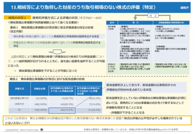 こちらについては、特に問題は指摘されていません。つまり、純資産価額の計算方法については現行のままで問題ないという立場です。問題となっているのは、「類似業種比準価額」で、こちらに対して会計検査院からかなり強い指摘が入っているというのが実情です。