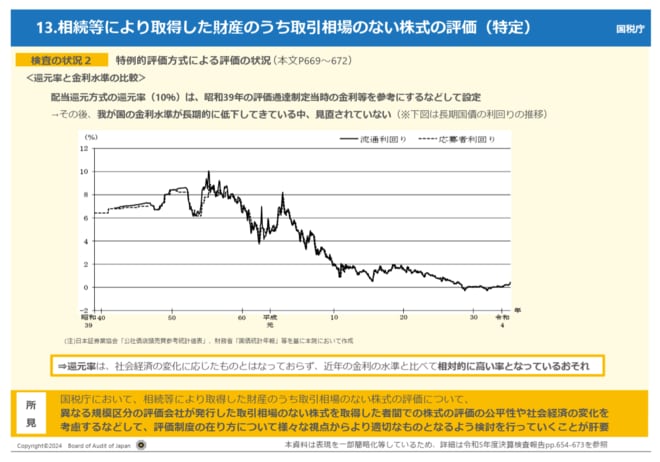 2. 特例的評価方式(配当還元方式)による評価の状況:昭和39年制定以来、金利水準が大きく変化しているにもかかわらず、還元率が据え置かれており、株価が不当に低く抑えられていると指摘されています。