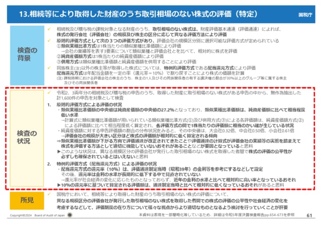こうした指摘を反映すれば、類似業種比準価額は上昇することになります。評価額が上がれば、当然ながら相続税も上がることになります。以上が、会計検査院からの主な指摘内容です。
