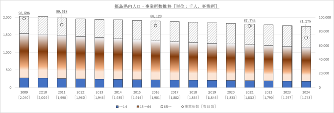 結果は明確な右肩下りで、誤解を怖れずに言えば、金融機関経営の持続可能性への検証が求められても致し方ない印象を受けます。事業者数もほぼ同調した動きとなっているため、講じられる手段は全て講じてでも人口や事業所数減を下げ停めなければならないように映ります。