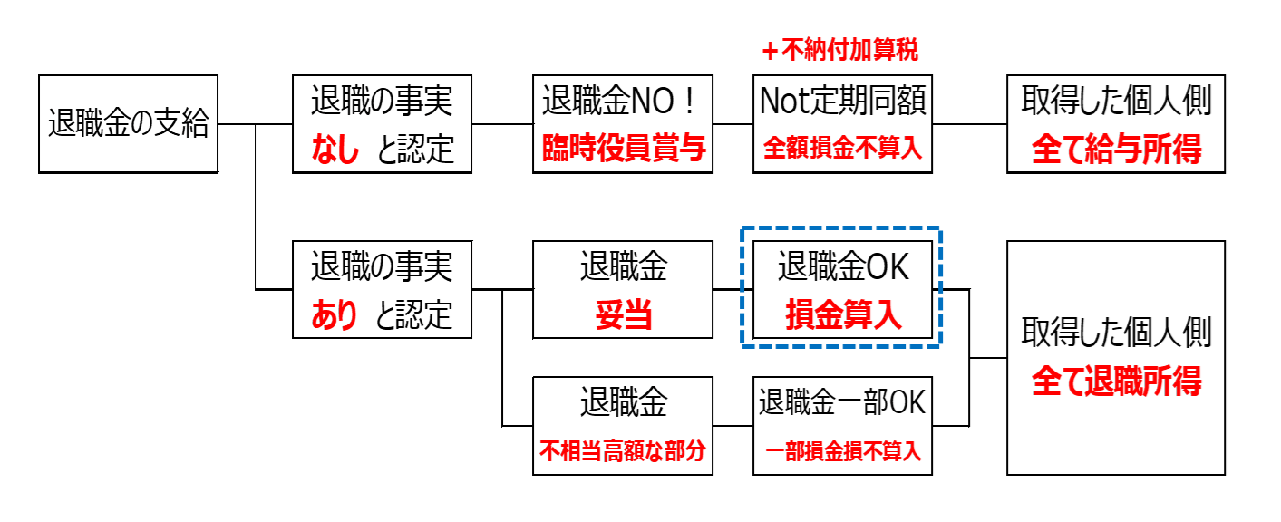 このように、退職の事実の有無と金額の妥当性によって、損金算入できる範囲が大きく変わる点がポイントとなります。