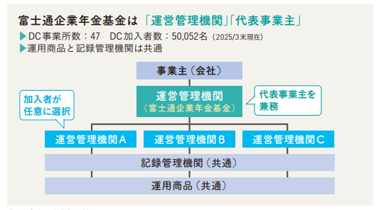 DC導入は2014年10月と比較的後発であり、当基金が代表事業主と自社運営管理機関を兼ねています。そのもとに二次運管となる外部の運営管理機関3社を配し、加入者が任意で選択できる仕組みを構築。現在はグループ連結対象外等を含む47事業所、約5万人の加入者を抱える規模となっています。