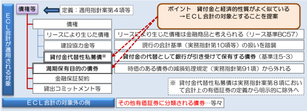 まずは、ECLの適用範囲に「債権等」という概念が新たに設けられ、ここに満期保有目的の債券や「貸付金代替性私募債」(貸付金の代替として銀行が引き受けて保有する債券)が付け加えられた。逆にいえば、図表1で述べたとおり、「分類・測定」などは今回のECL草案の対象外であるため、時価会計が適用される有価証券などもECL会計の適用対象外である(図表2)。