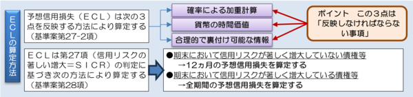 ECLは①確率による加重計算、②貨幣の時間価値、③合理的で裏付可能な情報、という3つの要素を反映する方法で算定する必要があるとされている(図表4)。