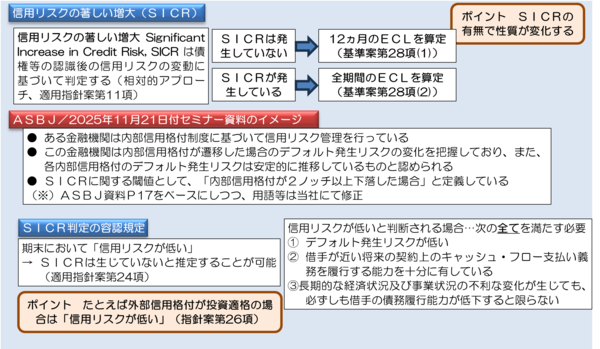 ここで参考になるのが、「信用リスクの著しい増大」という概念だ。ASBJ説明会資料の記述によると、英語の“Significant Increase in Credit Risk”を略して「SICR」と呼ぶらしいが、この「信用リスクの著しい増大(SICR)」が生じているかどうかで、12ヵ月分のECL(デフォルトが期末から12ヵ月以内に生じた場合の損失額の期待値)を算定するか、それとも当該債権等の全期間のECLを算定するかが決まる。そして、SICRは「相対的アプローチ」、たとえば「債務者の内部格付が3ノッチ下がる」など、その企業があらかじめ決めていた現象が起きた場合に発生したと認識するのが原則とされるが、「絶対的アプローチ」、すなわちたとえば「期末時点の内部格付などが高い場合にはSICRは発生していないとみなす」といった方法も認められる、などとしている(図表3)。