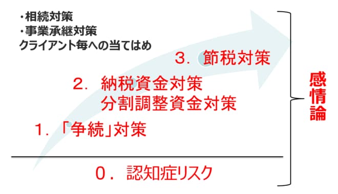 改めて、冒頭の図をご覧ください。「3.節税対策」として、節税を行うのかどうか。行う場合、自社株の評価を下げるのかといった選択肢が出てきます。また、節税だけでなく、評価をコントロールしつつ資金も確保しておかなければなりません。さらに、「2.納税資金対策・分割調整資金対策」として、後継者が必要な資金を確実に用意できるようにしておくという視点も欠かせません。そして当然ながら、兄弟間で争いが生じないよう、遺言を残しておくという「1.争族対策」も重要になります。