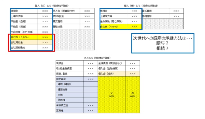 その点、自社株であれば「これなら見せてもいい」という流れになりやすく、決算書を預かることができます。個人財産は見せたくないが、決算書であれば提示できる——これは多くのオーナーに共通する心理です。決算書があれば自社株の評価がおおよそつかめますので、相続税の概算も把握できます。そうすることで、「このくらい相続税がかかる見込みです」といった注意喚起が可能になります。