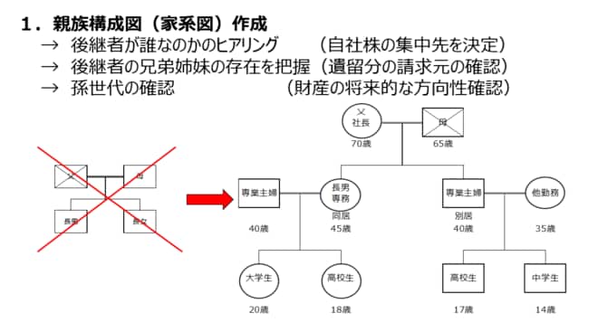 自社株の評価額が把握できたら、次のステップとして親族構成図(家系図)を作成します。これを用いることで、相続人が何人いるのか、誰にどの財産が渡りそうかといった全体像が一気に見えてきます。