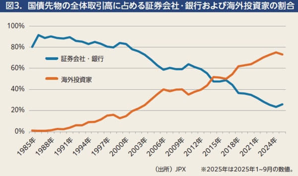 2007~2008年のサブプライムローン問題に端を発した世界金融危機を経て、2010年に米国で成立したドッド・フランク法やバーゼル規制を始めとする金融危機を防ぐための規制強化により、銀行・証券は自己トレーディングの規模を大幅に縮小した。特に国内債券市場では、2013年以降は低金利環境下で収益機会を失い、この流れが顕著となった。長期国債先物の銀行・証券の自己部門の取引高は、2024年時点で最も活発だった1980年代後半と比較して6分の1程度まで減少した。一方で、長期国債先物の全体の取引高は2008年の金融危機を脱した2013~2022年の間は横ばいであり、2022年~2024年は増加傾向にある(図4)。銀行・証券の自己トレーディングの減少分を埋めたのは、海外投資家の増加である。海外投資家は2024年時点で全体取引高の70%超を占める。