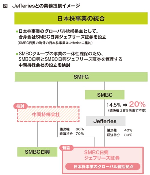 戦略的強化のポイントは次の4点に集約できる。すなわち、①日本株事業の統合、②資本関係の強化(ジェフリーズへの出資比率を経済持分ベースで20%まで引き上げ)、③EMEA地域における協働強化、④新規ファイナンスの提供、である。このうち、SMBC日興の組織改編は①の日本株事業統合の受け皿創設の一環として行われる。