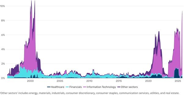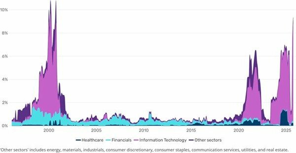 EV/売上高倍率は、企業の企業価値を年間売上高と対比させる指標です。この指標は、その株式が割安か割高かを評価するもので、一般的に倍率が低いほど割安な銘柄であることを示唆します。足元では、MSCIワールド指数の構成ウェイトの25%以上でEV/売上高倍率が10倍超となっており、高水準であったドットコムバブル期やコロナ禍後の局面を上回っています。われわれはこのような状況はいずれ正常化し始めると考えていますが、焦点となるのは、これらの特定の銘柄(その大半は米国のハイテク株)の株価の上昇を正当化できるほどのペースで、売上が成長できるかどうかという点です。