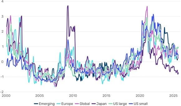 縦軸は、各地域のこの指標のZスコア※2の時系列推移を示しています。相対ベースで見たバリューの観点からの投資機会は、2000年代初頭、2009年、および2020年から2022年にかけて大きく拡大していたものの、足元では米国大型株と日本株という2つの例外を除けば、概ね銘柄間の予想益利回りで見たバリュエーションのばらつきは、平均的な水準にあります。米国大型株では、バリュエーション・ストレッチは約+1シグマ※3に達しており、通常よりもバリューの観点からの投資機会が広がっていること(=銘柄間のバリュエーションの格差が大きい)を示唆しています。対照的に、日本株は約-0.8シグマ※4となっており、バリューの観点からの投資機会が小さいことを示唆しています。これに基づくと、他の条件が同じであり、株価がバリュエーションを反映した適正な水準へと向かえば、2026年の割安度に着目した株式投資は標準的なパフォーマンスになると予想されます。地域別では、日本株ではパフォーマンスがやや抑制され、米国大型株ではより高い水準となる可能性があります。