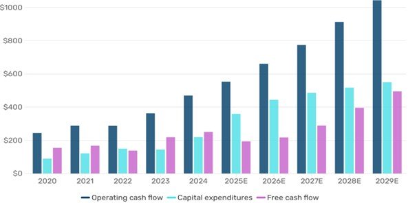 図表4:Microsoft、Amazon、Meta、Google、Oracleのキャッシュフローと設備投資の推移と今後の予測(単位:10億米ドル)