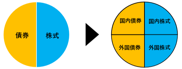 株式と債券の基本的な特徴をお伝えしたら、資産全体のアセットアロケーションの検討に進みましょう。円グラフを書き、半分に割って、それぞれに株式と債券とを書き込みます。そしてさらにそれを半分にし、国内と海外に分けます。円グラフは4分割された状態です。これは日本の公的年金積立金を運用する年金積立金管理運用独立行政法人(GPIF)と同様のポートフォリオであると伝えます。