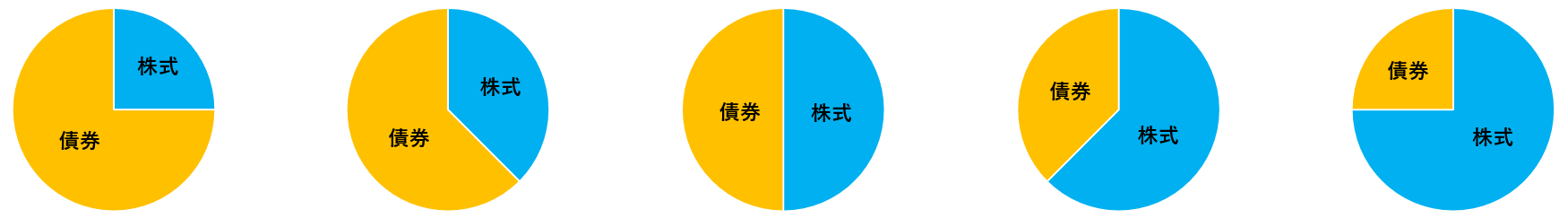 続いて円グラフを3つか5つほど書き、株式が多めのものから、債券多めのものまで段階的に比率に変化をつけたものを示し、お客さまに「どのくらいがご自分に合っていると思いますか」と質問します。このように提示すれば、お客さまは自分で選ぶことができます。幸いなことに筆者は、この段階まで来てお客さまに「あなたが決めて」と言われたことはありません。こうしてアセットアロケーションが決定します。なお、このような図はその場で手書きをしながら解説するとお客さまは自分のための提案だと理解し集中して話を聞いてくれます。