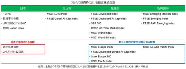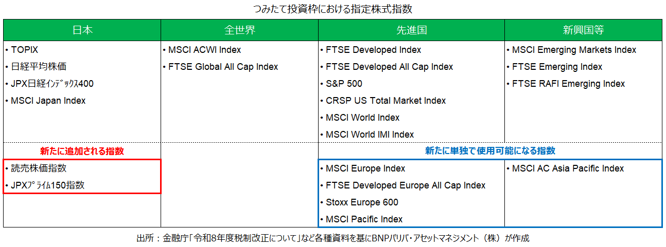 なお、冒頭で指摘したように1月に資金流入額が増加する傾向にあるのは、NISAの年間投資枠が暦年でリセットされることが大きな理由となっています。とりわけ、つみたて投資枠の対象商品は1月の資金流入額が増加しているケースが多く、S&P500やMSCI全世界株式(ACWI)といった指数を対象としたインデックスファンドへの資金流入が目立っていました。このつみたて投資枠における指定株式指数ですが、昨年末に明らかになった与党の「令和8年度税制改正大綱」によれば、欧州株式の指数が単独で使用可能になるなど、いくつかの制度拡充も盛り込まれています。つみたて投資枠の対象年齢を撤廃する「こどもNISA」の創設は大きく報じられている通りですが、この対象商品の拡充は米国株からの地域分散をさらに促進する可能性を秘めています。具体的には、これまで他の指数との組み合わせでのみ活用できた欧州やアジア・太平洋地域の株式指数(下図の青枠内)に単独で連動する商品がつみたて投資枠で投資可能になることが見込まれています。欧州株のパフォーマンスが重要であることは言うまでもありませんが、こうした制度の拡充によって欧州株ファンドなどの品揃えが増え、投資家のポートフォリオの選択肢が広がることが期待されます。
