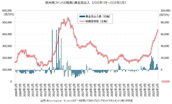 外国株式型ファンド全体で見れば欧州株へのアロケーションが増えていると言えますが、欧州株ファンドに限って見れば、資金流入は限定的です。次のグラフに示したように、2月の欧州株ファンドの資金流入額は+46億円と13カ月連続の資金流入を記録したものの、1月の+101億円から減速しました。それでも、欧州株ファンドの残高は2月末時点で4300億円を超え、2015年12月以来10年超ぶりの高水準となっており、2月にも欧州株ファンド2本が新規設定されるなど、欧州株ファンドへの関心は引き続き強いようです。