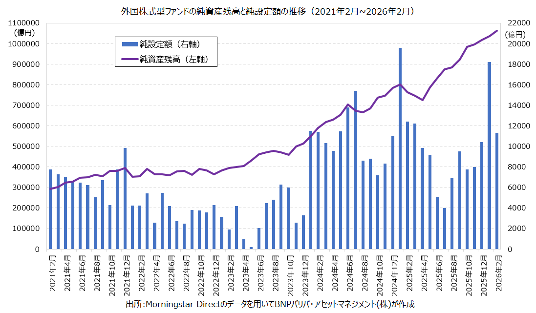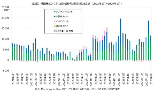 また、外国株式型ファンドの内訳をみると、引き続きグローバル株式や米国株式に投資する株式ファンドを中心に高水準の資金流入が見られますが、グローバルと米国への資金フローの動向が少し変わってきたようです。世界経済の不透明感が高まり、米テクノロジー株の値動きが不安定となる中で、米国株ファンドへの資金流入が減速傾向が見られます。新NISAがスタートした2024年は、米国株ファンドの資金流入が+6.6兆円だったのに対し、グローバル株ファンドは+4.9兆円にとどまっていました。2025年は4月までは米国株ファンドへの資金流入がグローバル株ファンドを上回っていましたが、その後は10カ月連続でグローバル株ファンドの資金流入額が米国株ファンドを上回っています。とりわけ、2026年に入ってグローバル株ファンドへの資金シフトがより顕著になっていることがグラフからも確認できるでしょう。グローバル株ファンドにおける地域配分で米国の次に欧州が大きいケースが多いことを勘案すれば、緩やかながらも米国から欧州への資金シフトが起きているとも言えそうです。今年1月には米国を除くグローバル株式に投資するファンドが2本新たに設定されていますが、これも欧州株へのアロケーションを通じた地域分散を期待する動きと考えられます。