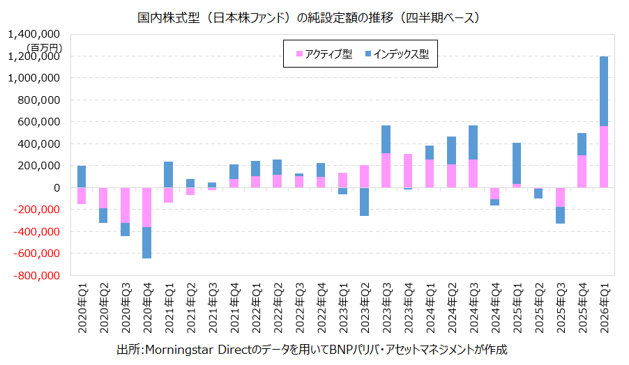 ここで日本株ファンドへの資金流入について、もう少し詳しく見てみましょう。日本株ファンドをインデックス型とアクティブ型に分けてみると、1-3月の資金流入額+1兆2000億円のうち、半分強の+6400億円程度がインデックス型に向かっています。このうち+4500億円程度が日本株相場の急落した3月に記録されており、その大半は日経平均に連動するインデックス型ファンドに資金が向かっています。この一部は短期的な値幅取りを狙った資金が含まれていると言えるでしょう。一方で、アクティブ型は1-3月に+5600億円程度と、2025年7-9月に資金流出を記録した後、再び資金流入が加速しています。対面販売が中心とみられるアクティブ型の日本株ファンドは、販売手数料がかかるファンドが多く短期的な値幅取りと考えにくいことから、より中長期的な見通しに基づく投資が多いと思われます。そういった意味では、国内の物価上昇圧力が強まる中で、個人投資家が日本企業の業績や日本株相場に対して強気な見方を維持しているものと考えられます。