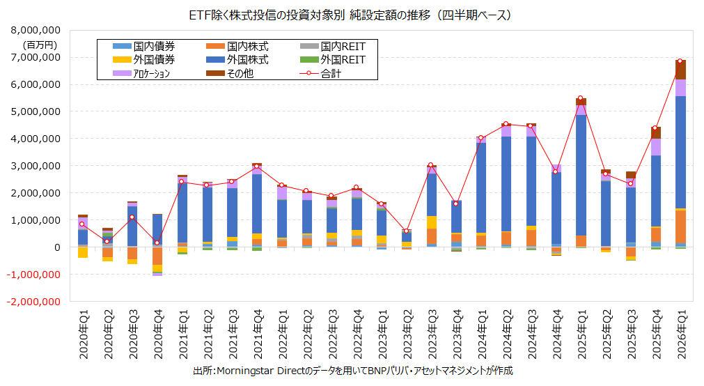 2026年1-3月の投信市場への資金流入が過去最高水準となりました。4月13日に資産運用業協会が公表した3月の投資信託概況によれば、個人投資家の動向を反映する上場投資信託(ETF)を除く追加型株式投信の1-3月の資金フローは+6兆7196億円の資金流入と、2025年1-3月に記録した+5兆3270億円を上回り、過去最高記録を大幅に更新しています。新NISAがスタートした2024年以降、1月の資金流入額が膨らむ傾向があるものの、今年3月には2025年1月、2026年1月に続いて3度目となる月間2兆円を超える資金流入額を記録するなど(1月以外では初めて)、好調な資金フローが続いています。以下、投資信託評価を手掛けるモーニングスターのデータを用いて、どの資産クラスに個人マネーが向かったのか確認していきたいと思います。